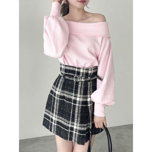 スウェットトップスをオフショルデザインにすることで、女性らしく仕上げました。