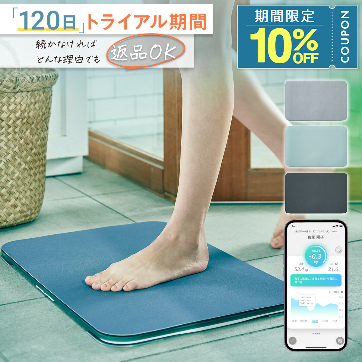 見た目はシンプルなバスマットで「体重表示がない」のがポイント。毎日の体重変化は自動的にスマホに記録され、体重を見るストレスからあなたを解放します。一般的なスマホ連動の体重計と違い、Wi-Fi接続のため毎回Bluetooth接続する必要もありません。USB充電方式なので電池不要、フル充電で3ヶ月以上使用可能です。