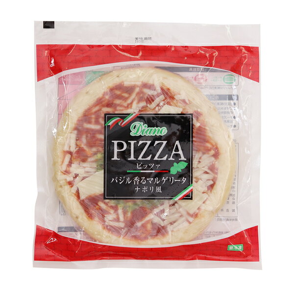 トマトににんにくやオレガノを合わせたソースのコクとモッツアレラの甘み、バジルの風味が特長のピザです。ふっくらと厚みがあるピザ生地を使いました。(冷凍食品)