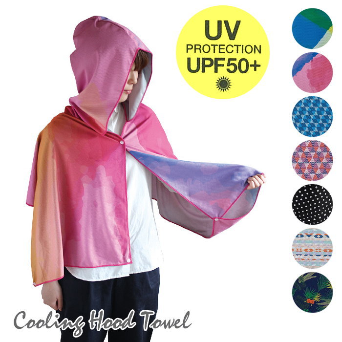 冷感日焼け防止フード付きタオル。紫外線遮蔽率98.4%のUVカット生地なので日焼け対策にぴったり!