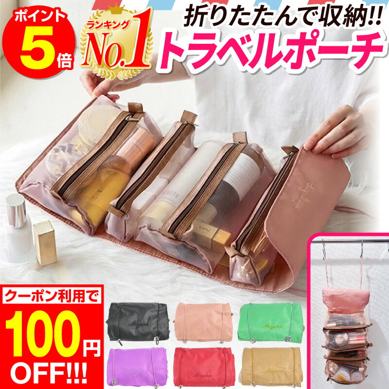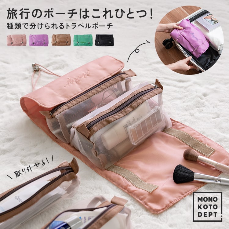吊り下げられて、取り外し可能な撥水素材のトラベルポーチ!