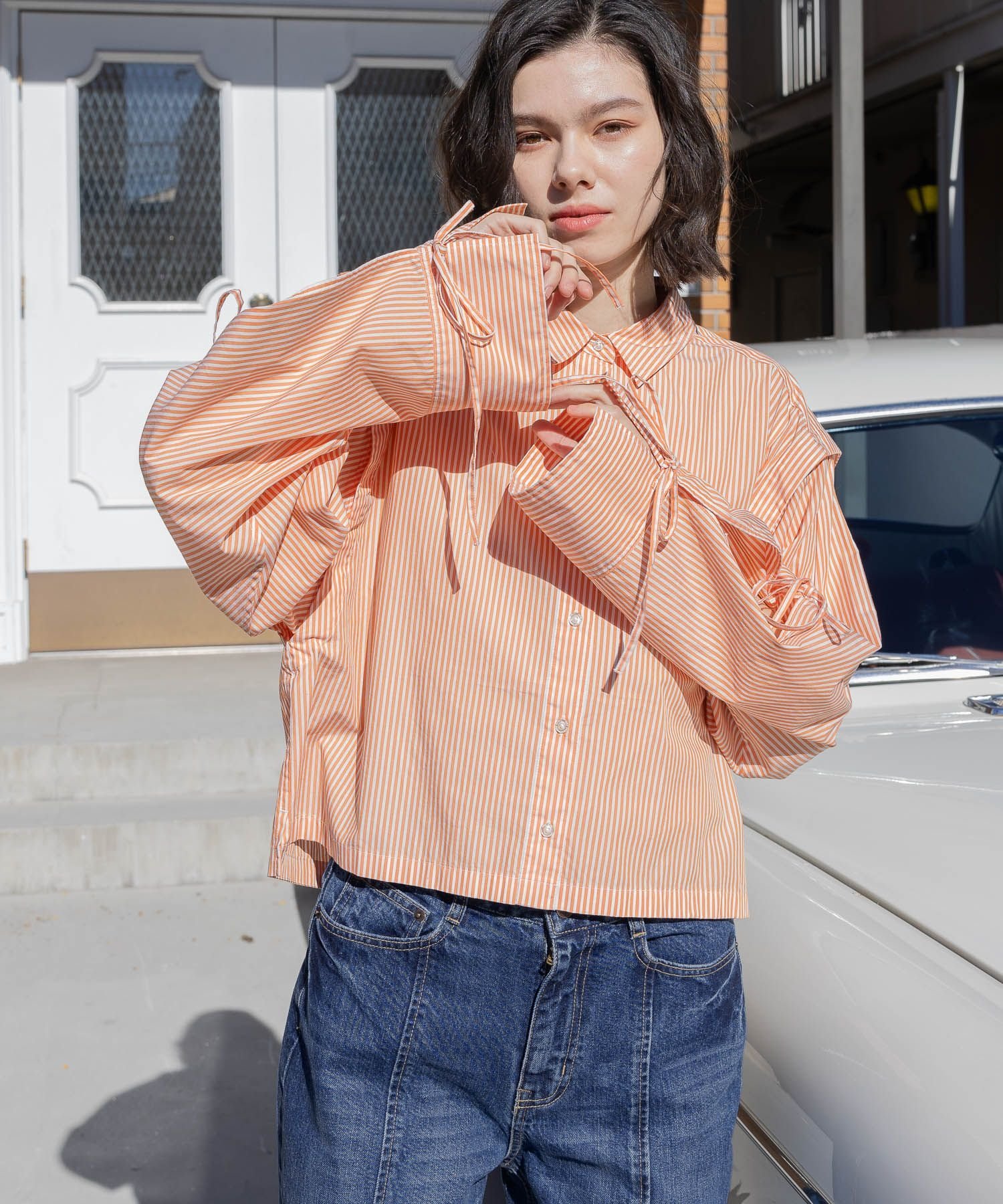 袖のスリット&細めのリボン結び