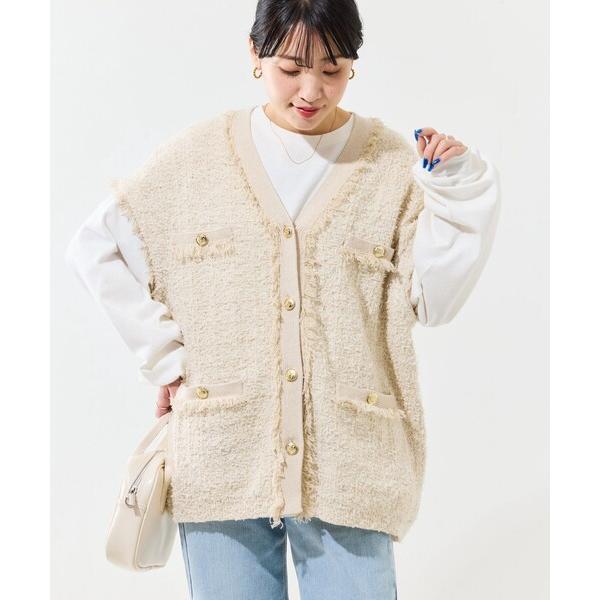 さわやかで春っぽいツイードGジャン。裾がフリンジになっていてデザイン性が高い!